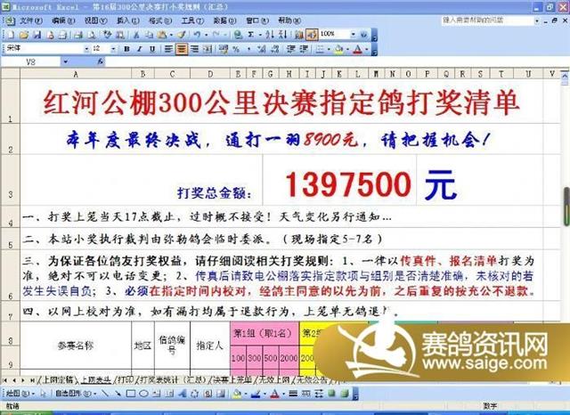 感谢广大鸽友一如既往的支持!本届预赛指定鸽打奖总金额已高达77万,同比去年增长百分之十!
