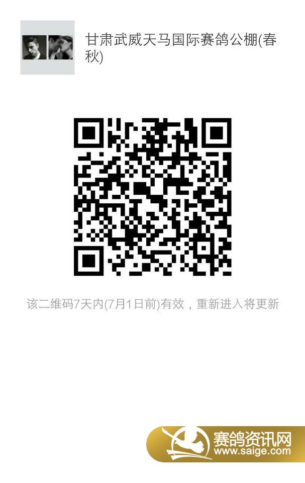 为搭建甘肃武威天马国际赛鸽公棚交流新平台,我公棚已组建微信群,欢迎大家加入“甘肃武威天马国际赛鸽公棚”微信群。大家只需要手机微信扫描的下图微信二维码,即可加入我公棚微信群,并将“群昵称”按“鸽舍+鸽友姓名”的格式进行修改备注。
