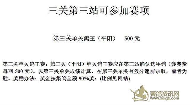 2.顺翔俱乐部17年秋季三关赛第三站可参加赛项:第三关单关鸽王赛(平阳)(500元)