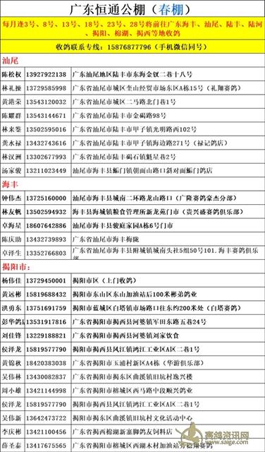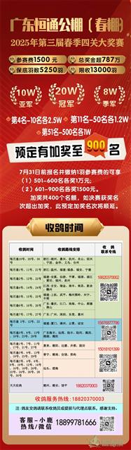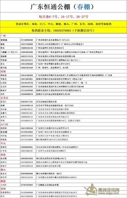 尊敬的鸽友,大家好!广东恒通春棚定于7月16号前往肇庆、江门、珠海、中山、顺德、佛山,专线联系:18820370002; 7月17号(线路一):前往广州、深圳、东莞、惠州,专线联系:18820370002; 7月17号(线路二):前往惠来、潮阳、达濠、井都、陇田,专线联系:15018101399; 7月18号:前往广东海丰、汕尾、陆丰、陆河、揭西、棉湖、揭阳,专线联系:15876877796; 预定有加奖(7月31日前报名并缴纳1羽参赛费的可享受501-600名各奖1万元,601-900名各奖1500元,加奖共400个名额;如决赛获奖名次超出加奖,此预定加奖名次将顺延) 如需送鸽的鸽友请提前与本地代收点及司机联系,谢谢大家支持!