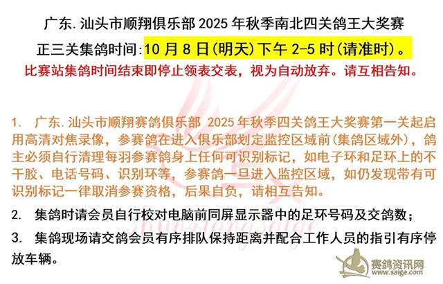 . 广东.汕头市顺翔俱乐部2025年秋季南北四关鸽王大奖赛正三关集鸽时间:10月8日(明天)下午2-5时(请准时)。