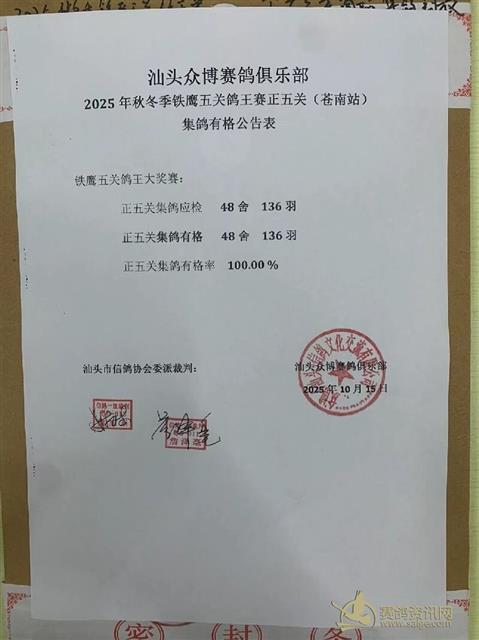 . 众博2025年秋冬季铁鹰五关鸽王赛正五关(苍南站)集鸽上笼清单及缴费明细!以此表为准!