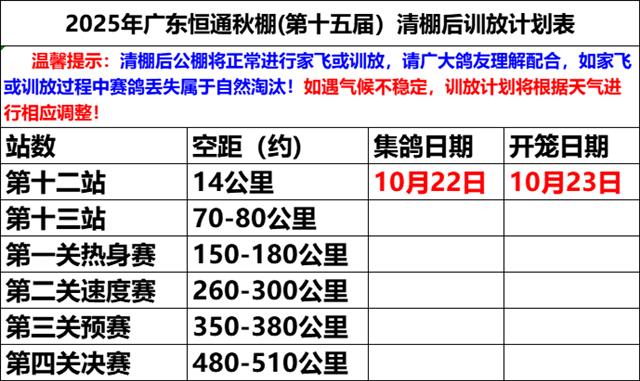 广东恒通(秋棚)第十二站约14公里训放定于2025年10月22日晚集鸽,10月23日早上开笼!如遇恶劣天气,则改期另行通知!