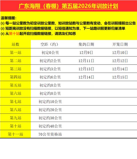 广东海翔(春棚)第四站6公里训放定于2025年12月14日晚集鸽,15日早上开笼!如遇恶劣天气,则改期另行通知!