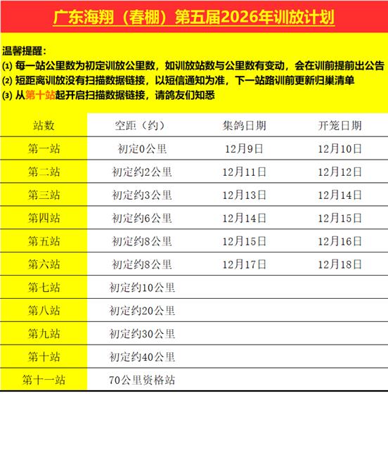 广东海翔(春棚)第六站8公里训放定于2025年12月17日晚集鸽,18日早上开笼!如遇恶劣天气,则改期另行通知!
