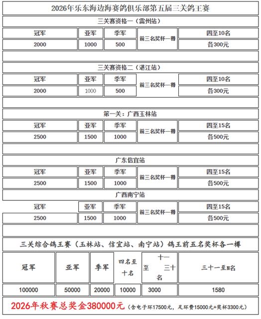 24.2026年乐东海边海赛鸽俱乐部第五届三关综合鸽王赛售环保底奖金共计380000元,定3000枚足环销售完部不再增加;售环超2500枚后,超12枚增设1名三关鸽王尾奖(31名至N名);三关综合获奖鸽王前十名俱乐部免费提供相框。