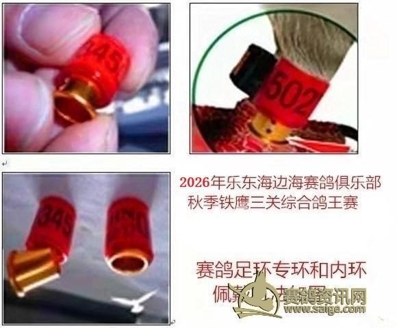 4.2026年乐东海边海赛鸽俱乐部的足环和金属内套环必须按规定佩戴于参赛鸽的同一只脚上,内环底拖必须托着主环(内环翻边在下)。