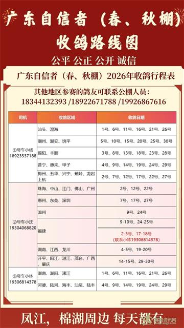 . 广东自信者赛鸽公棚(春、秋棚)收鸽路线