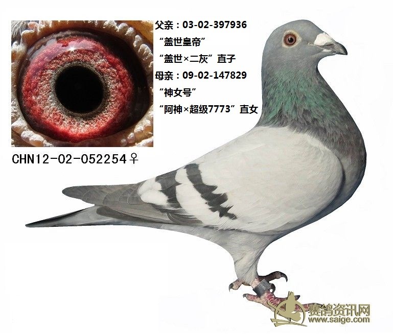 鸽子名称: 足环:2012-02-052254 性别:♀雌鸽 眼别:砂 羽色:灰 年代:2012 血统:盖世 作育者:焦云龙