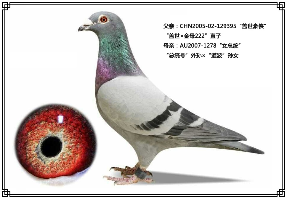 鸽子名称: 足环: 性别:♂雄鸽 眼别: 羽色: 年代:2009 血统: 作育者:焦云龙