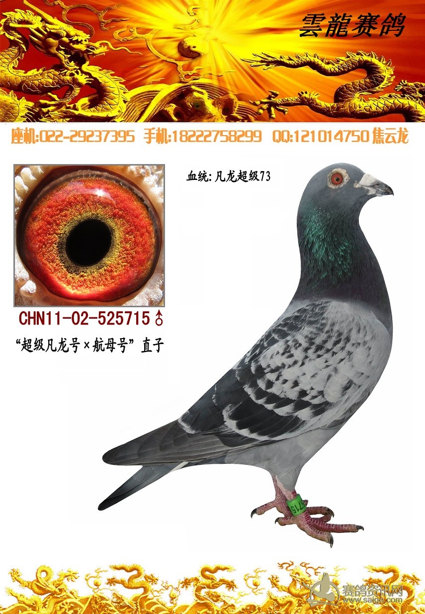 鸽子名称: 足环:2011-02-525715 性别:♂雄鸽 眼别:黄 羽色:斑 年代:2011 血统:凡龙超级73 作育者:焦云龙