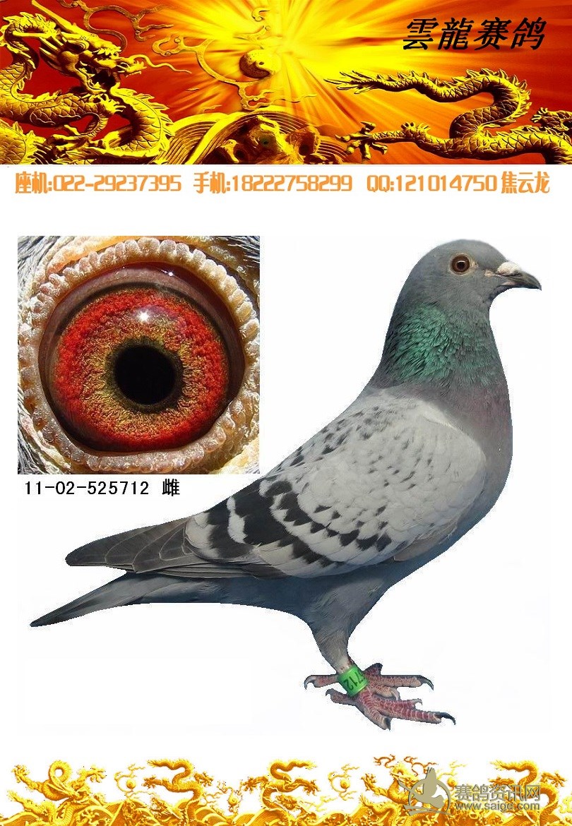鸽子名称: 足环:2011-02-525712 性别:♀雌鸽 眼别:黄 羽色:斑 年代:2011 血统:盖世 作育者:焦云龙