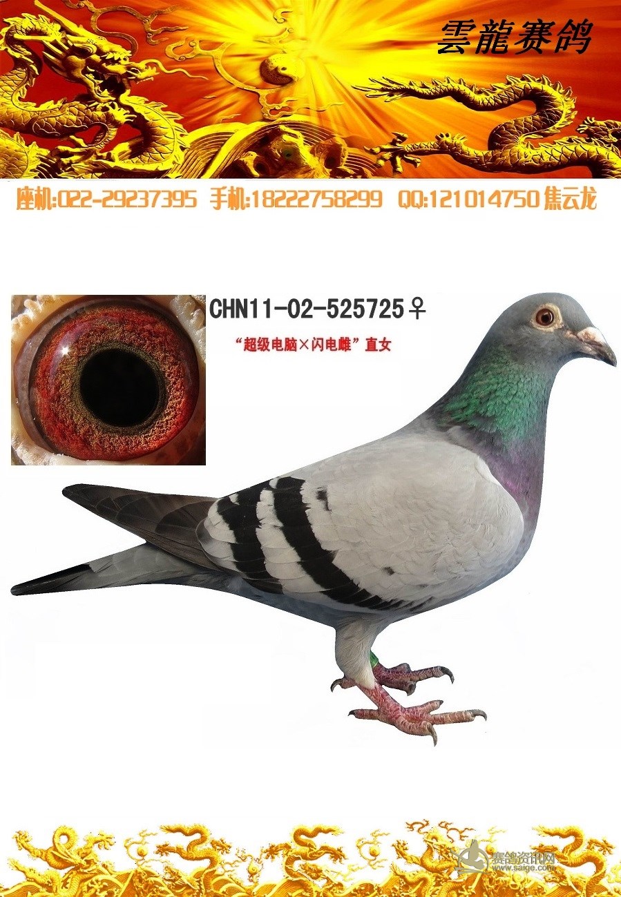 鸽子名称: 足环:2011-02-525725 性别:♀雌鸽 眼别:黄 羽色:灰 年代:2011 血统:戈马利 作育者:焦云龙