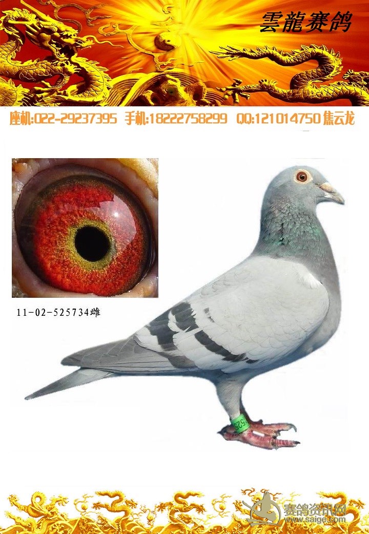 鸽子名称: 足环:2011-02-525734 性别:♀雌鸽 眼别:黄 羽色:灰 年代:2011 血统:盖世 作育者:焦云龙