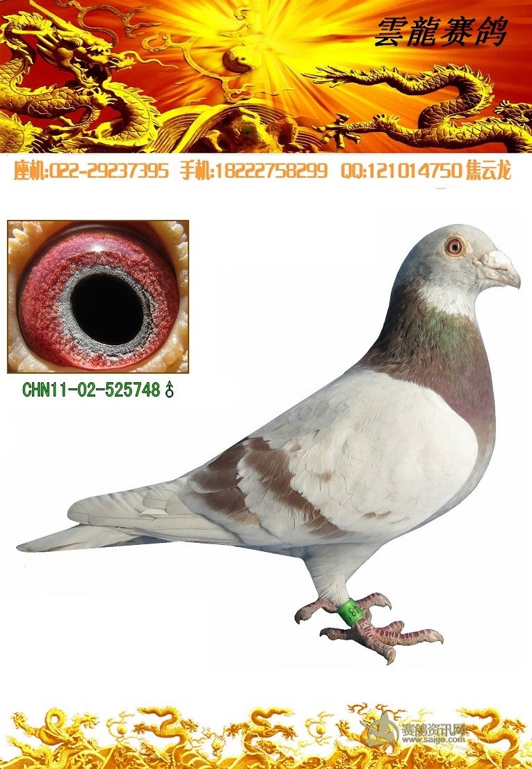鸽子名称: 足环:2011-02-525748 性别:♀雌鸽 眼别:砂 羽色:红轮 年代:2011 血统:杨铁伦×詹森 作育者:焦云龙