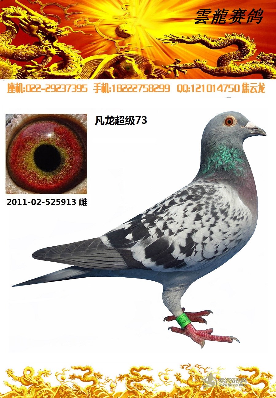鸽子名称: 足环:2011-02-525913 性别:♀雌鸽 眼别:黄 羽色:斑 年代:2011 血统:凡龙超级73 作育者:焦云龙
