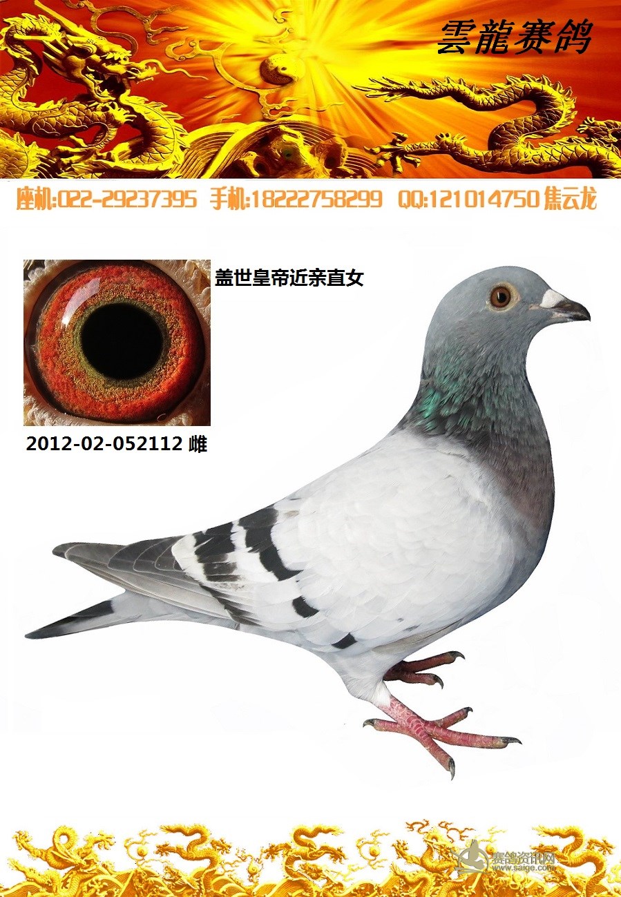 鸽子名称: 足环:2012-02-052112 性别:♀雌鸽 眼别:黄 羽色:灰 年代:2012 血统:盖世 作育者:焦云龙