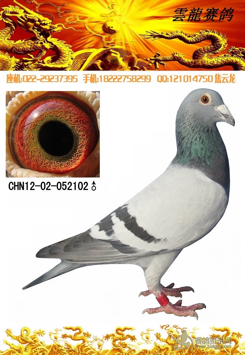 鸽子名称: 足环:2012-02-052102 性别:♂雄鸽 眼别:黄 羽色:灰 年代:2012 血统: 作育者:焦云龙