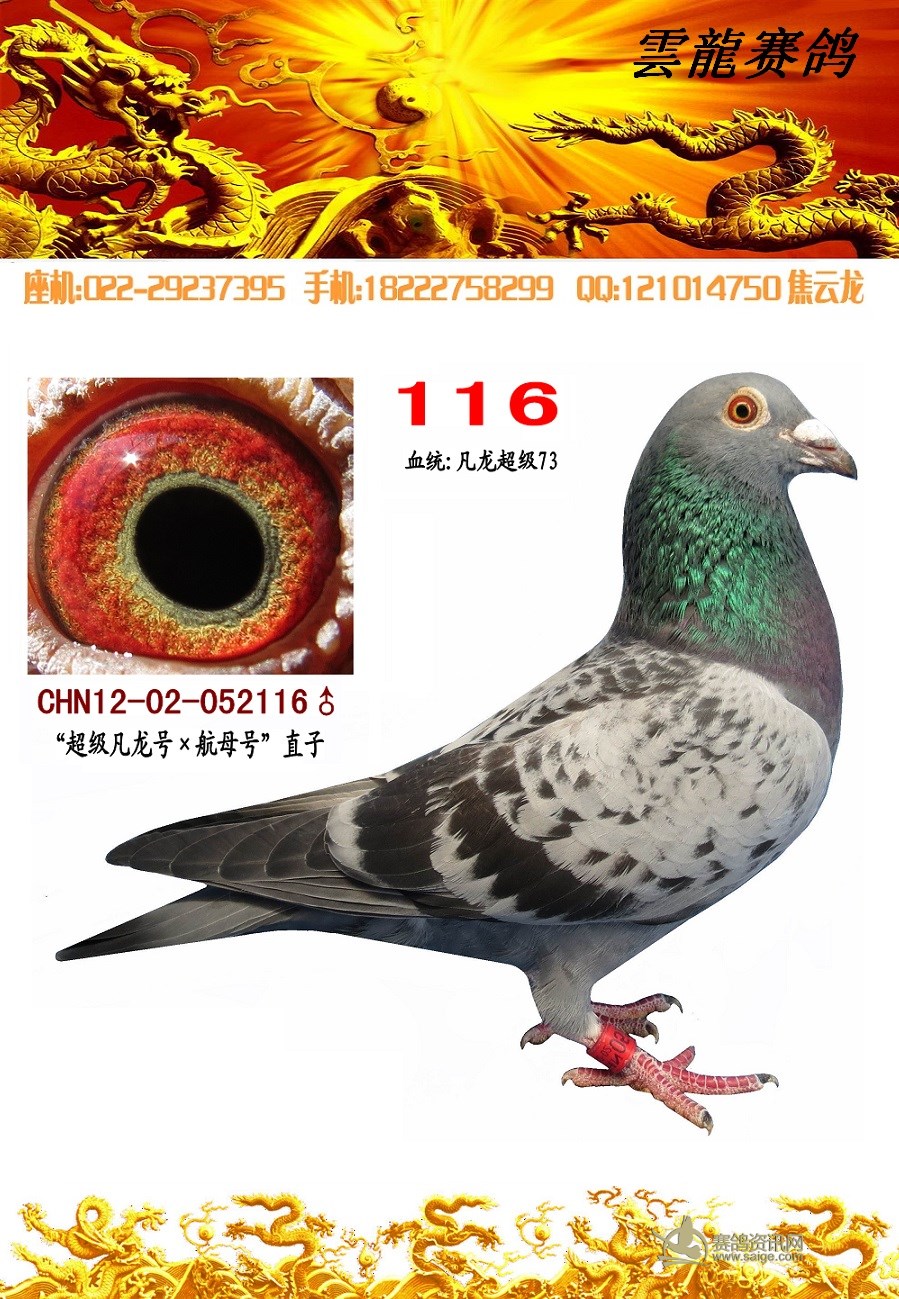 鸽子名称: 足环:2012-02-052116 性别:♂雄鸽 眼别:黄 羽色:斑 年代:2012 血统:凡龙超级73 作育者:焦云龙