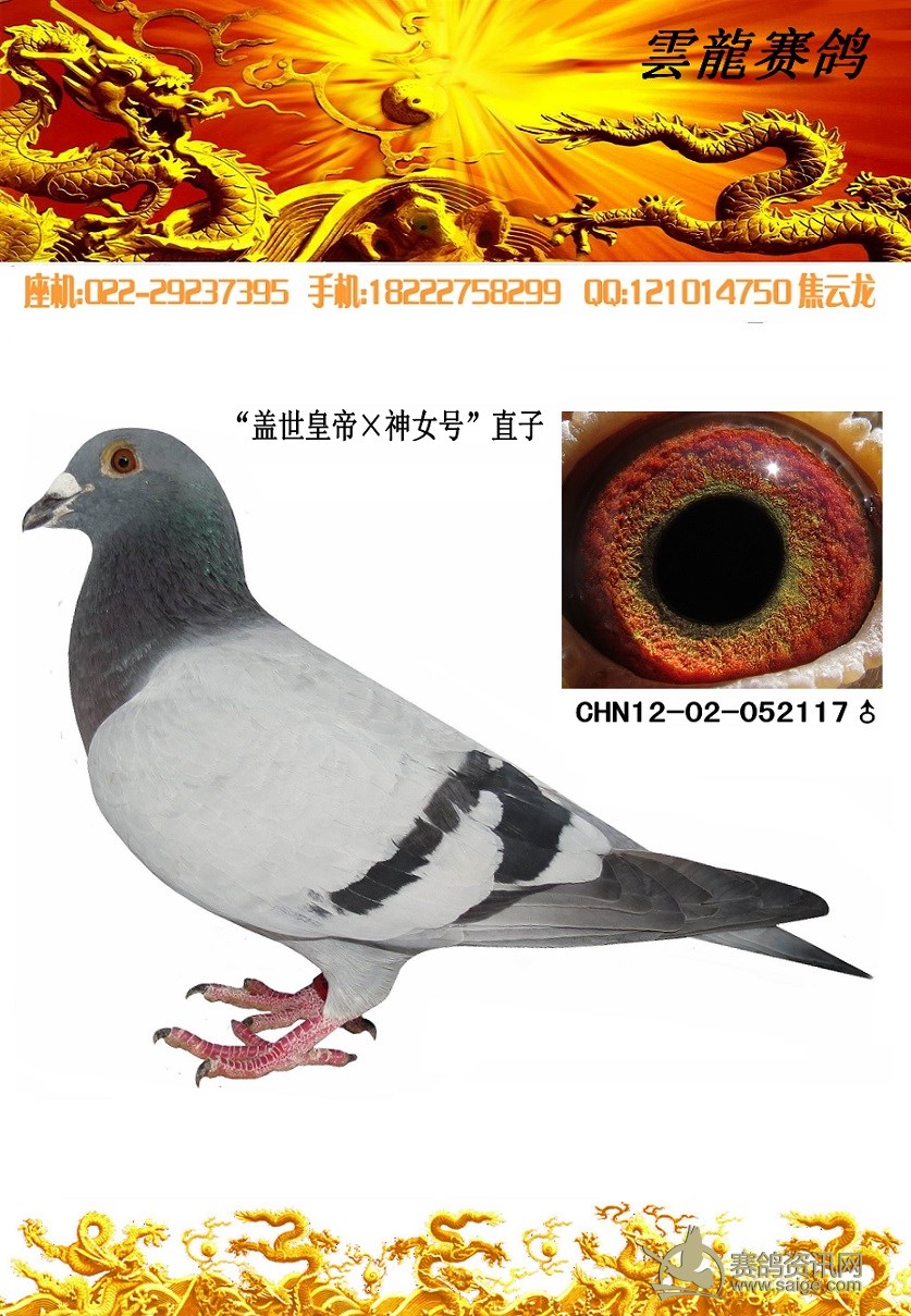 鸽子名称: 足环:2012-02-052117 性别:♂雄鸽 眼别:黄 羽色:灰 年代:2012 血统:盖世 作育者:焦云龙