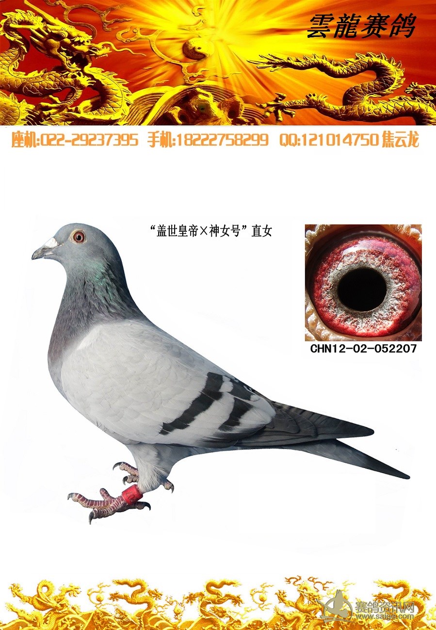 鸽子名称: 足环:2012-02-052207 性别:♀雌鸽 眼别:砂 羽色:灰 年代:2012 血统:盖世 作育者:焦云龙
