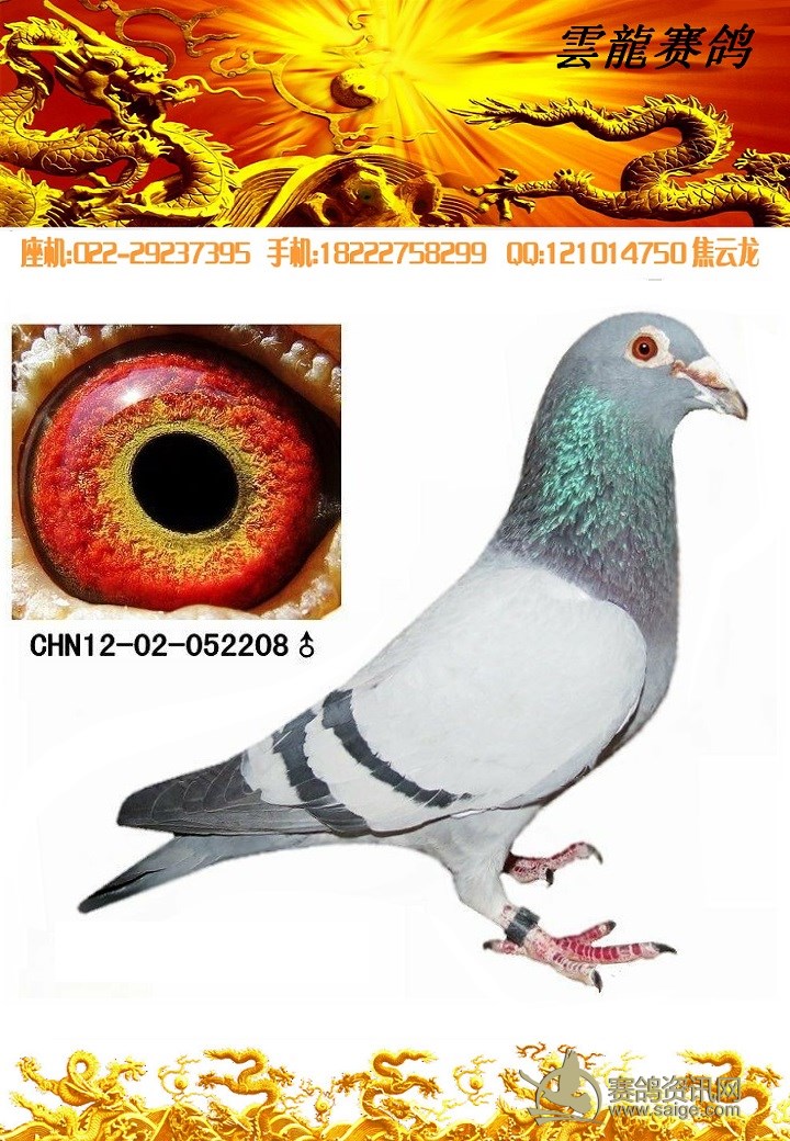 鸽子名称: 足环:2012-02-052208 性别:♂雄鸽 眼别:黄 羽色:灰 年代:2012 血统:盖世 作育者:焦云龙