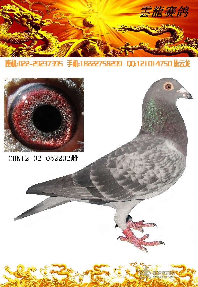 鸽子名称: 足环:2012-02-052232 性别:♀雌鸽 眼别:砂 羽色:石斑 年代:2012 血统:若大将 作育者:焦云龙