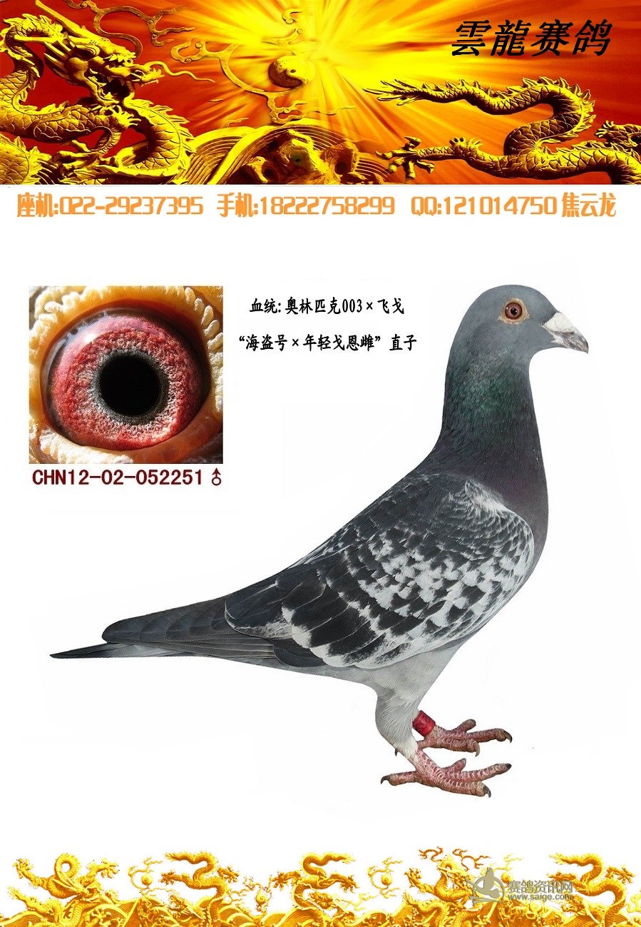 鸽子名称: 足环:2012-02-052251 性别:♂雄鸽 眼别:砂 羽色:斑 年代:2012 血统:奥林匹克003×飞戈 作育者:焦云龙