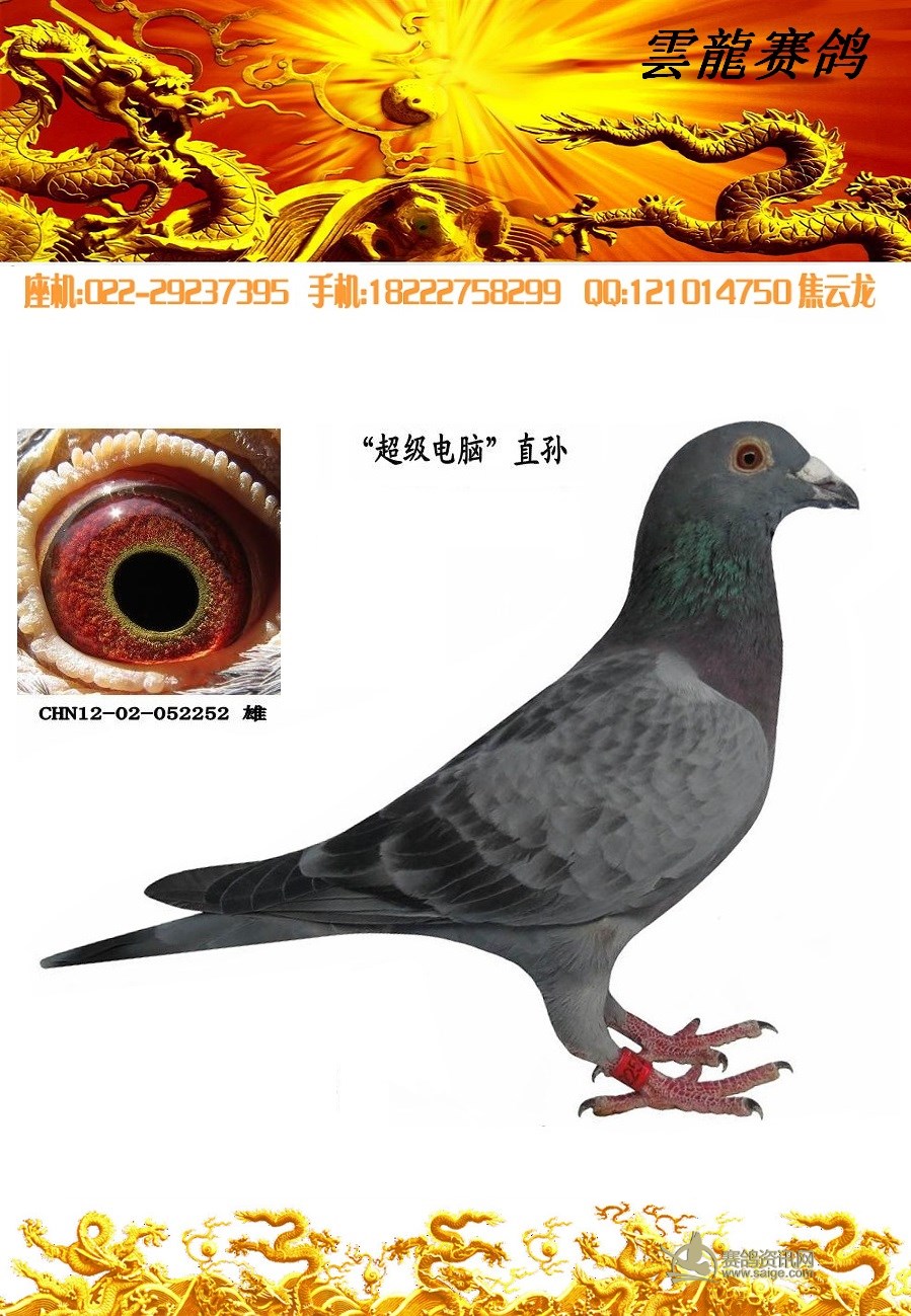 鸽子名称: 足环:12-02-052252 性别:♂雄鸽 眼别:黄 羽色:石板 年代:2012 血统:戈马利 作育者:焦云龙