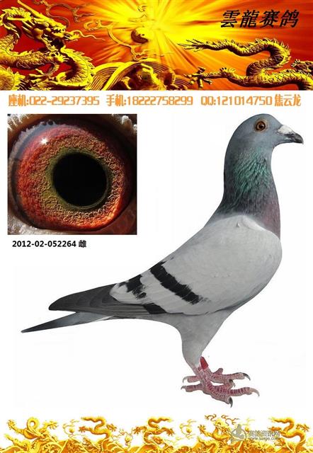 鸽子名称: 足环:2012-02-052264 性别:♀雌鸽 眼别:黄眼 羽色:灰 年代:2012 血统:盖世×神农 作育者:焦云龙