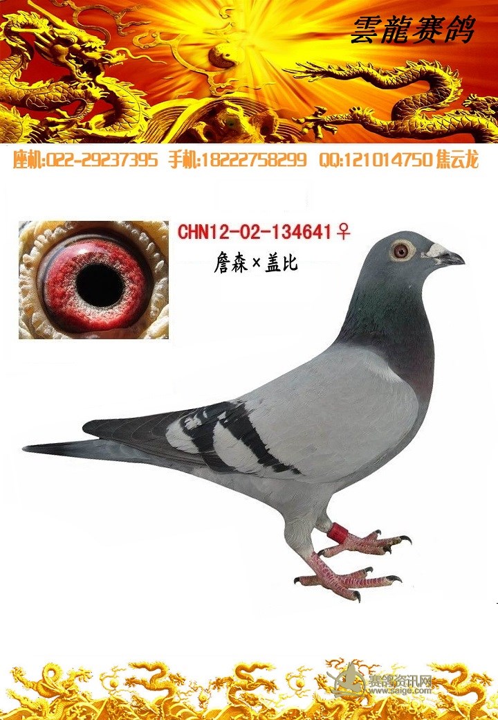 鸽子名称: 足环:2012-02-134641 性别:♀雌鸽 眼别:砂 羽色:灰 年代:2012 血统:盖世 作育者:焦云龙