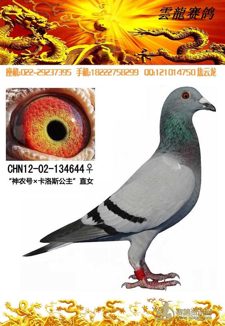 鸽子名称: 足环:12-02-134644 性别:♀雌鸽 眼别:黄 羽色:灰 年代:2012 血统:神农×卡洛斯公主 作育者:焦云龙