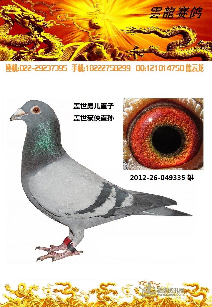鸽子名称: 足环:2012-26-049335 性别:♂雄鸽 眼别:黄 羽色:灰 年代:2012 血统:盖世 作育者:焦云龙