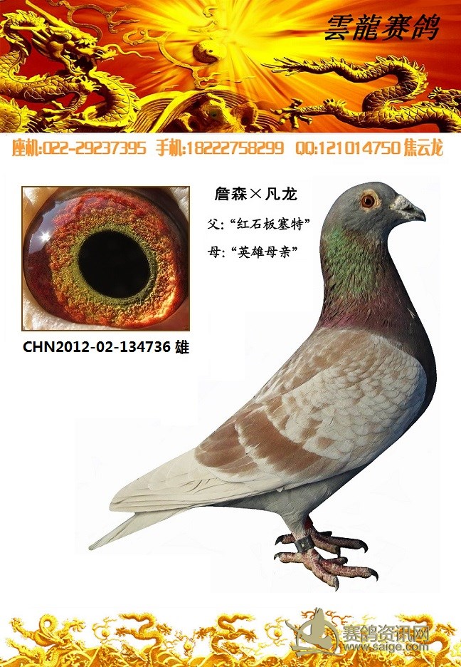 鸽子名称: 足环: 性别:♂雄鸽 眼别: 羽色: 年代:2012 血统:红石板39 作育者:焦云龙