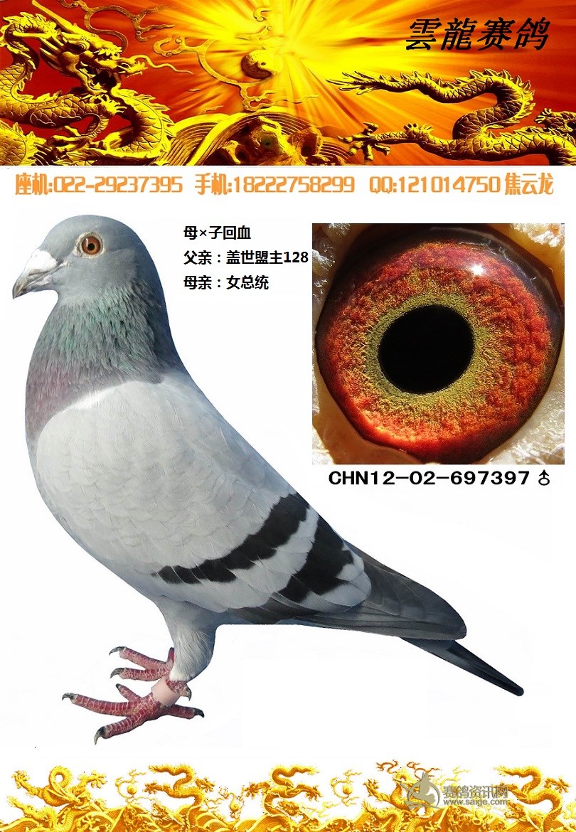 鸽子名称: 足环:2012-02-697937 性别:♂雄鸽 眼别:黄 羽色:灰 年代:2012 血统:盖世 作育者:焦云龙