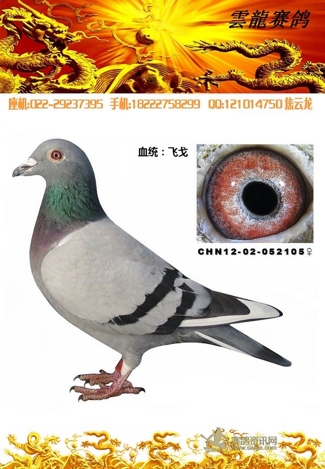 鸽子名称: 足环:2012-02-052105 性别:♀雌鸽 眼别:砂 羽色:灰白羽 年代:2012 血统:飞戈 作育者:焦云龙