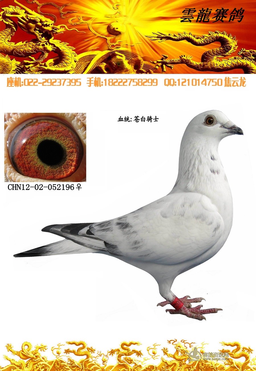 鸽子名称: 足环:2012-02-052196 性别:♀雌鸽 眼别:黄 羽色:白花 年代:2012 血统:苍白骑士 作育者:焦云龙