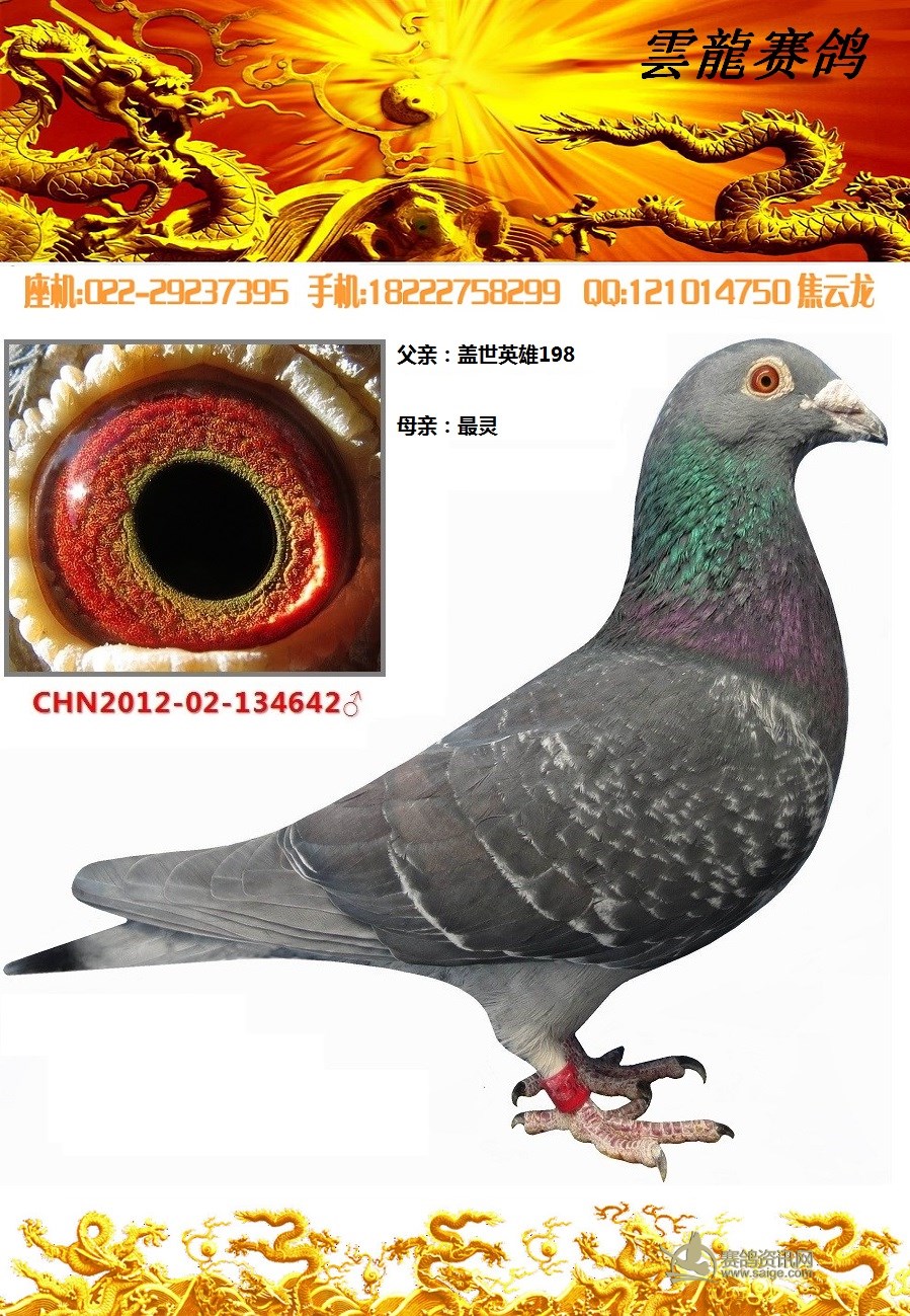 鸽子名称: 足环:2012-02-134642 性别:♂雄鸽 眼别:黄 羽色:黑斑 年代:2012 血统:盖世×最灵 作育者:焦云龙