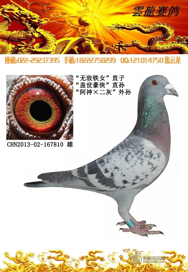鸽子名称: 足环:13-02-167810 性别:♂雄鸽 眼别:黄 羽色:斑 年代:2013 血统: 作育者:焦云龙