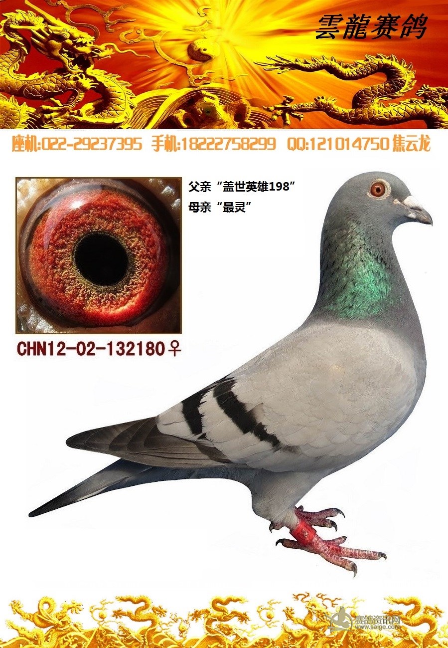 鸽子名称: 足环:2012-02-132180 性别:♀雌鸽 眼别:黄 羽色:灰 年代:2012 血统:盖世 作育者:焦云龙