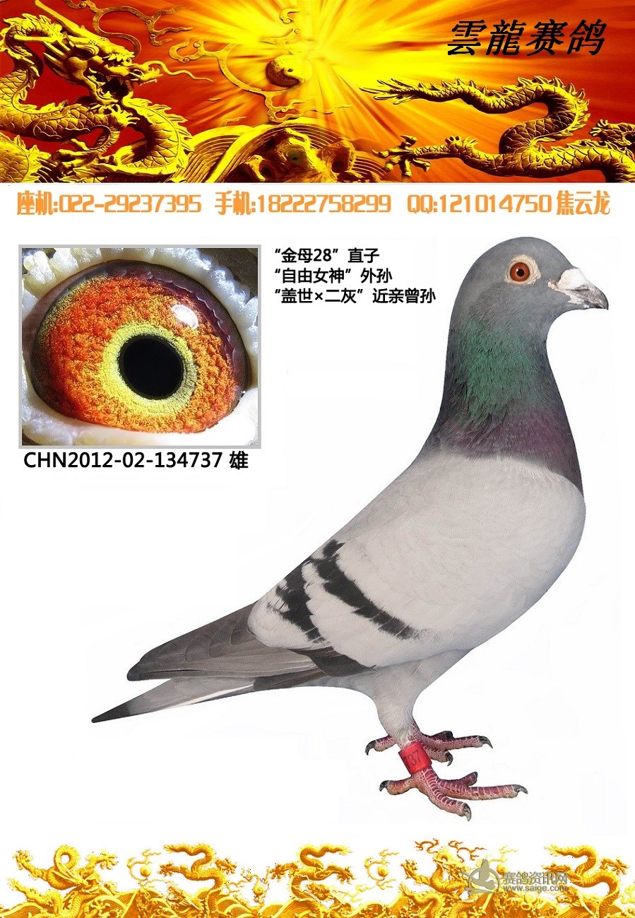 鸽子名称: 足环:2012-02-134737 性别:♂雄鸽 眼别:黄 羽色:灰 年代:2012 血统:盖世 作育者:焦云龙