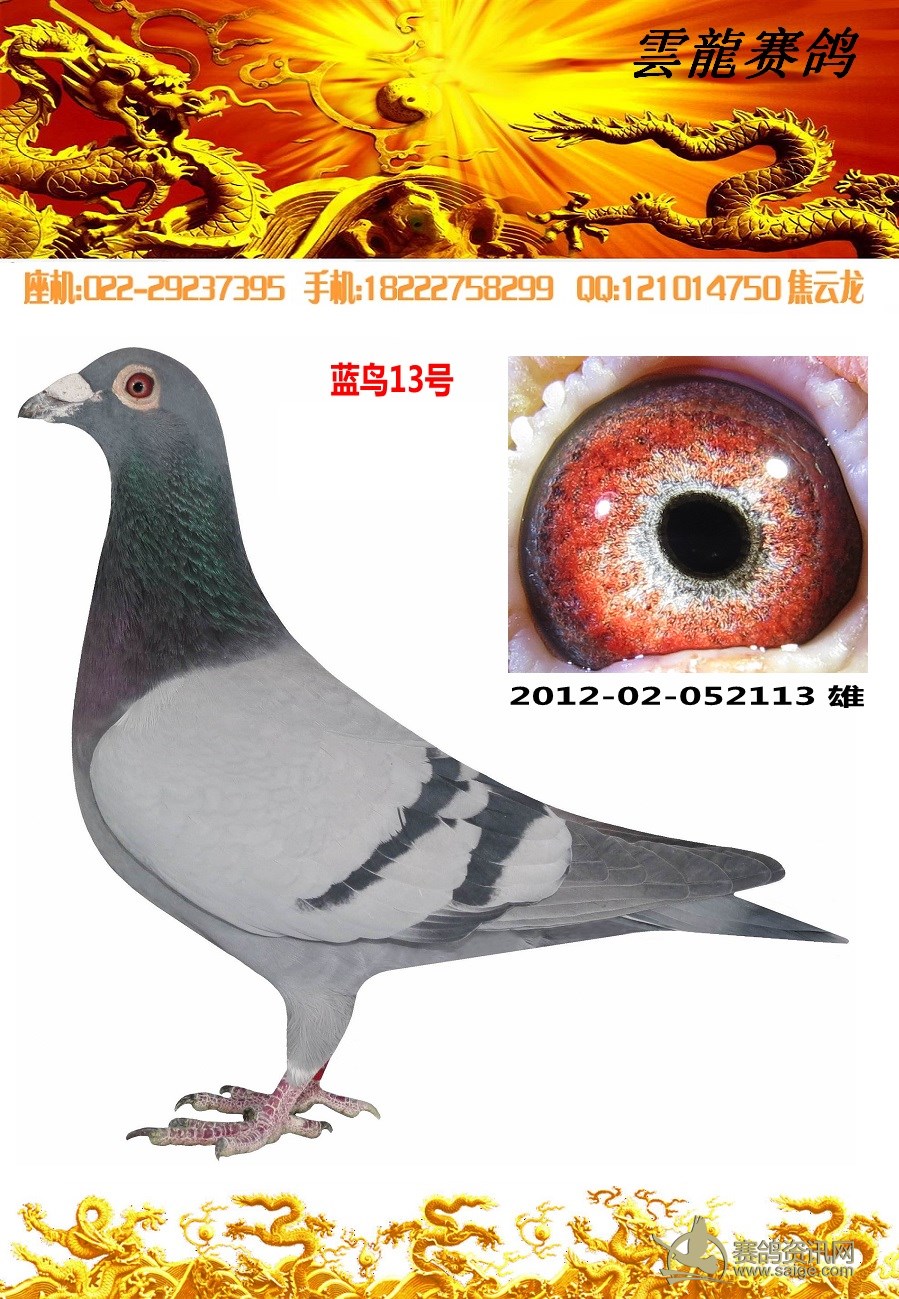 鸽子名称: 足环: 性别:♂雄鸽 眼别: 羽色: 年代:2012 血统: 作育者:焦云龙