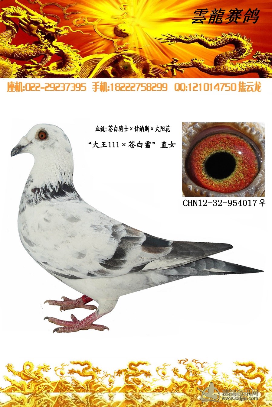 鸽子名称: 足环:2012-32-954017 性别:♀雌鸽 眼别: 羽色: 年代:2012 血统: 作育者:焦云龙