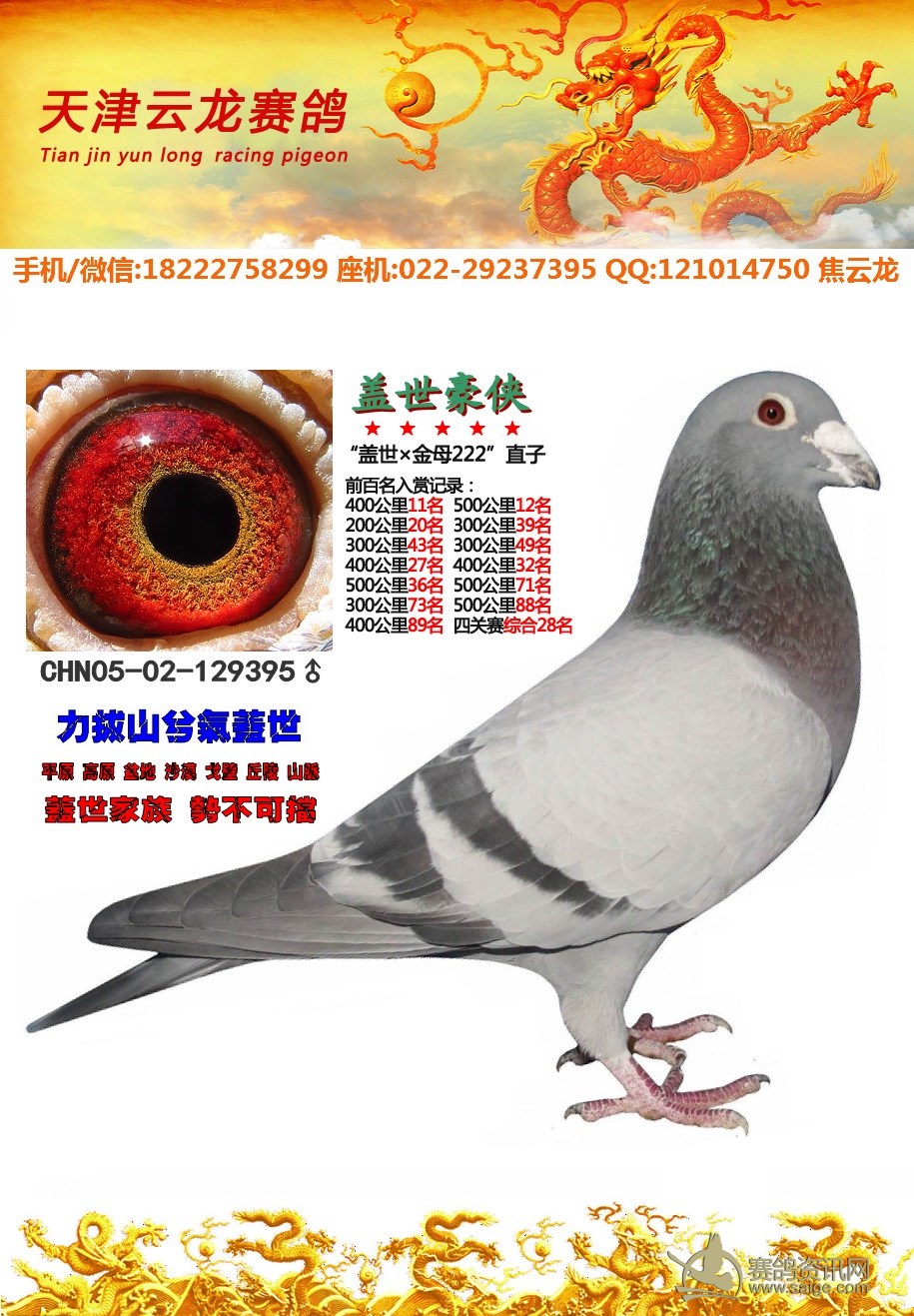 鸽子名称:盖世豪侠 足环:2005-02-129395 性别:♂雄鸽 眼别:黄 羽色:灰 年代:2005 血统:盖世 作育者:焦云龙