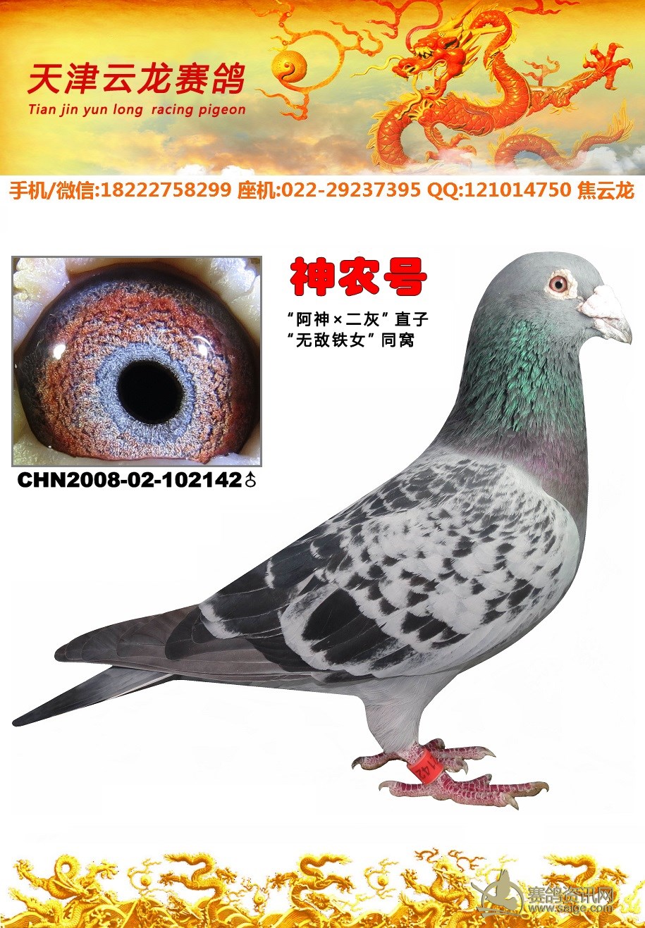 鸽子名称:神农号 足环:2008-02-102142 性别:♂雄鸽 眼别:砂眼 羽色:斑 年代:2008 血统:阿神×超级7773 作育者:焦云龙