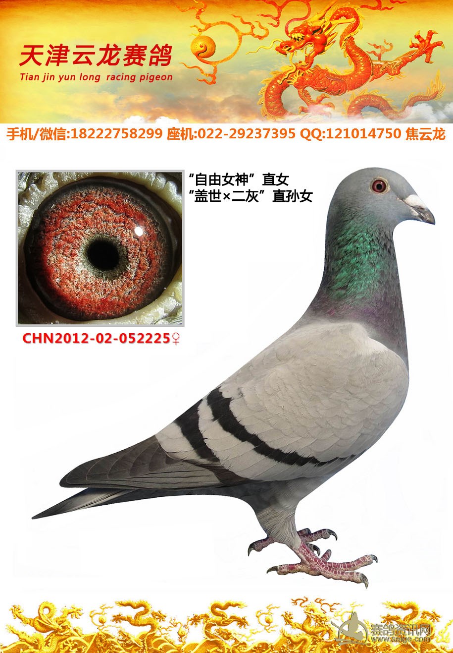 鸽子名称: 足环:2012-02-052225 性别:♀雌鸽 眼别:砂 羽色:灰 年代:2012 血统:盖世 作育者:焦云龙