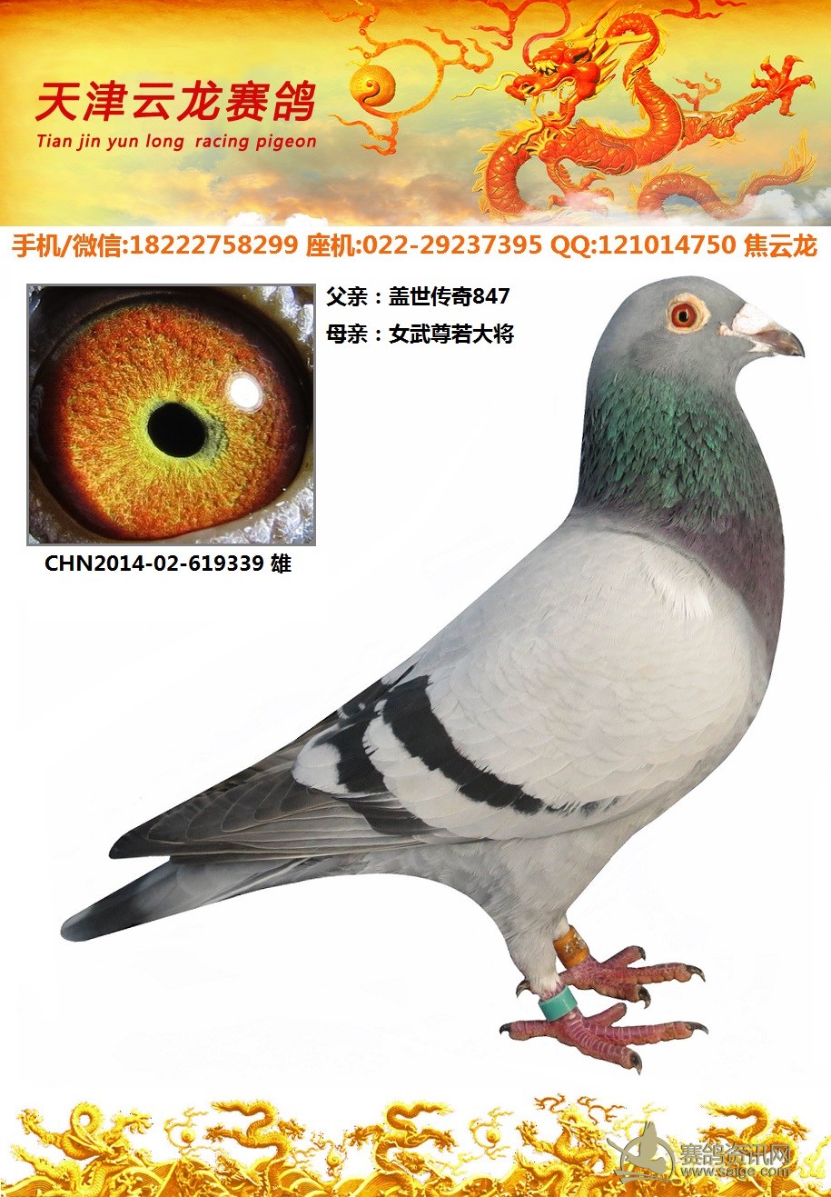 鸽子名称: 足环:2014-02-619339 性别:♂雄鸽 眼别:黄 羽色:灰 年代:2014 血统:盖世 作育者:焦云龙