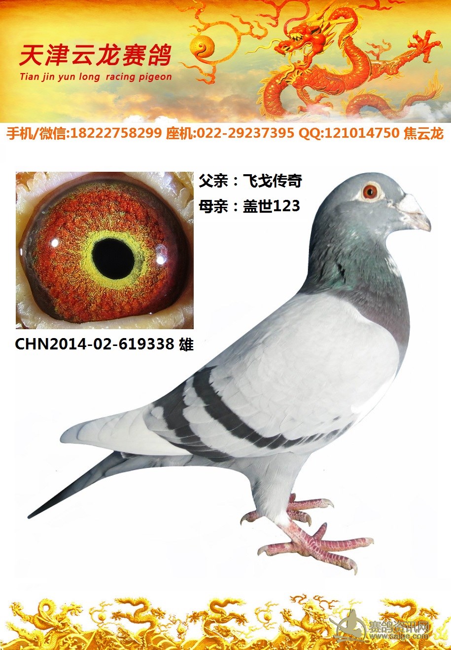 鸽子名称: 足环:2014-02-619338 性别:♂雄鸽 眼别:黄 羽色:灰白羽 年代:2014 血统:飞戈×盖世 作育者:焦云龙