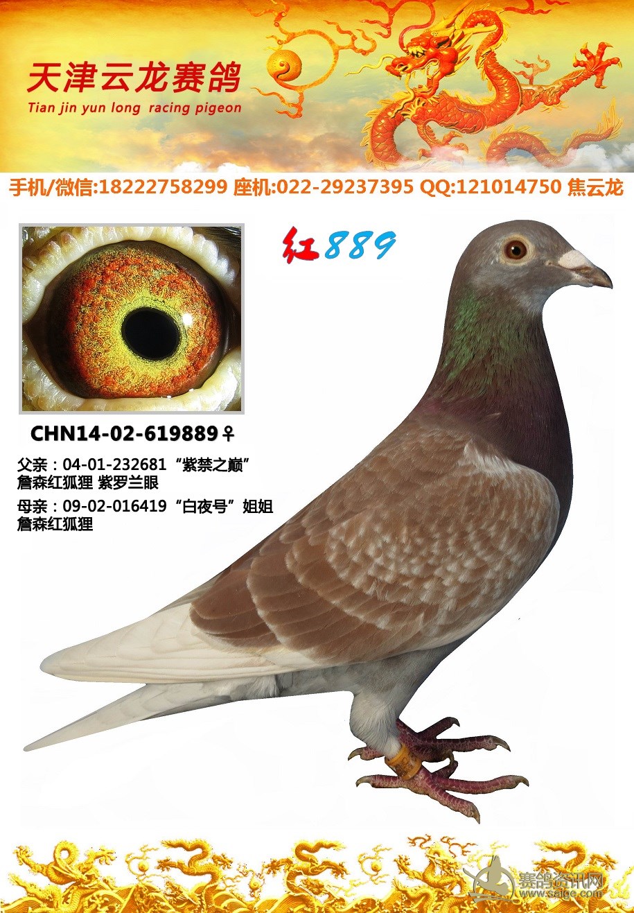 鸽子名称: 足环:2014-02-619889 性别:♀雌鸽 眼别:黄 羽色:红斑 年代:2014 血统:紫禁之巅 作育者:焦云龙