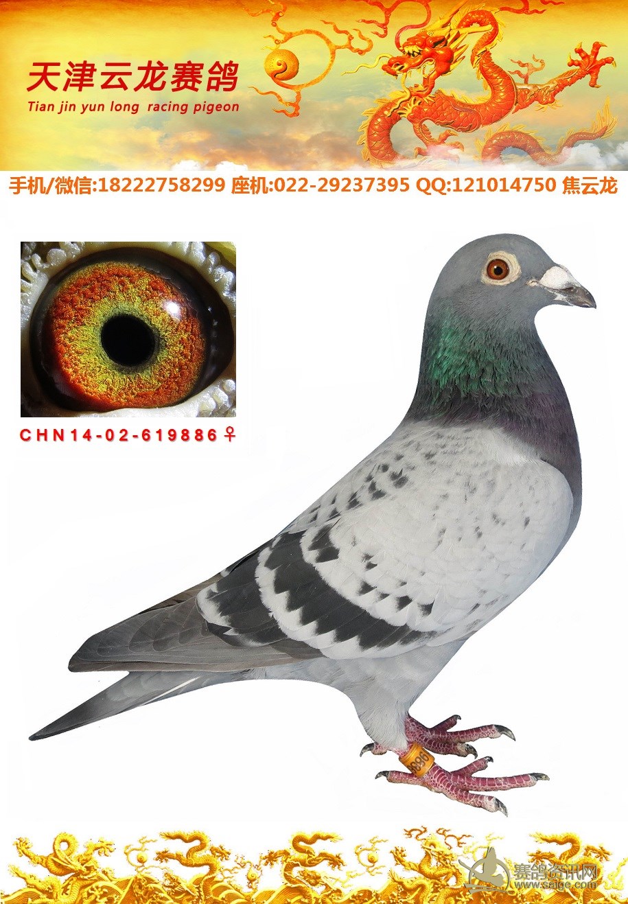 鸽子名称: 足环:2014-02-619886 性别:♀雌鸽 眼别:砂 羽色:浅斑 年代:2014 血统:詹森 作育者:焦云龙